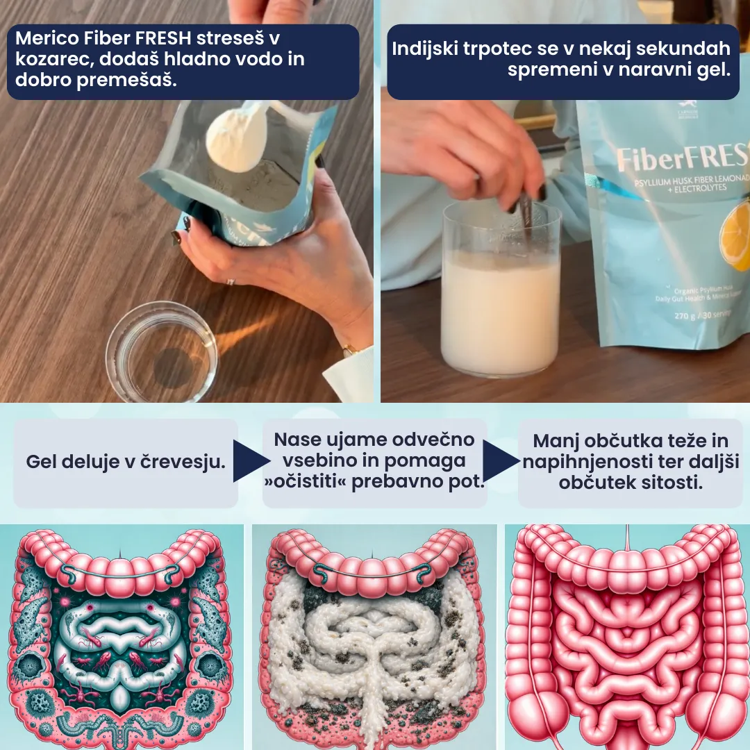 Takojšnja zgostitev ni minus, je dokaz, da vlaknine res delajo to, kar morajo. Indijski trpotec se ob stiku z vodo spremeni v naravni gel, ki se podobno oblikuje tudi v tvojem črevesju. Ta gel pomiri prebavo, podpre naravno gibanje črevesja in ustvari občutek lahkotnosti.